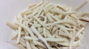- Сварете калмарите до готовност и ги нарежете на ивици.