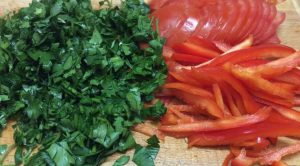 - Измийте домата и нарежете на тънки филийки, измийте ми пипера, обелете от опашката на дяловете и семената, нарязани на ивици и магданоз ситно котлет.
