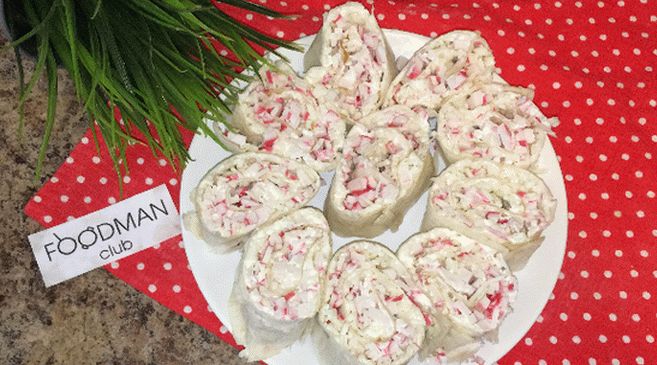 - Намажете лаваша с майонеза. Поръсете със сирене, раци пръчки.
