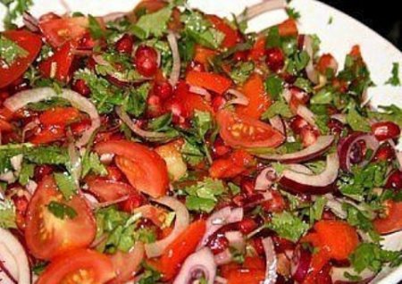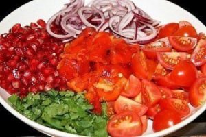 - Нарежете лука на половин пръстени, нарязайте на ситно килантрото, домати нарязани на половинки, отделете зърната от нар.