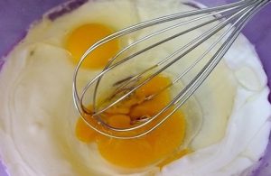 - Смесете растително масло, заквасена сметана, яйца, редовни и ванилова захар. Просто разбъркайте до гладкост, не размахвайте трябва да.