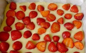- Покрийте формата с хартия или намажете с олио. Изсипете тестото разпределете ягодите отгоре, като внимателно изстисквате плодовете в тестото. Печете петдесет минути на 180 градуса.