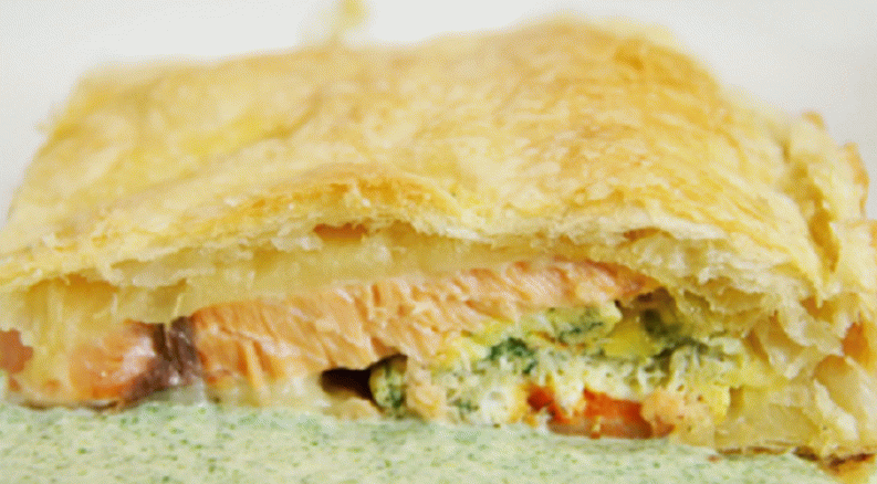 Споделям рецептата за приготвяне на вкусен пай от вкъщи бутер тесто. Пълнежът е сьомга и омлет. Сервирането на такъв пай е по-добре всичко горещо. Особено вкусен е с кремообразен сос.