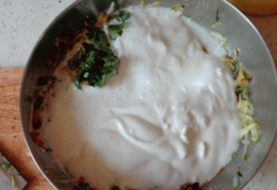 - Залейте ястието с кисело мляко, разбъркайте отново добре.