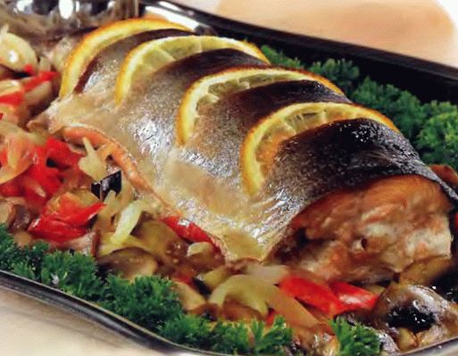 Нарязваме и задушаваме зеленчуците в отделен съд, докато се сварят наполовина, добавяне на растително масло. Нарязваме рибата на малки парчета, сол, добавете подправки, поръсете с лимонов сок и разбърква.