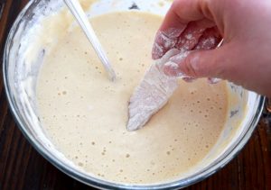 В отделна купа смесете майонезата, яйцата и брашното, консистенцията трябва да е малко по-гъста от фритерите. Ако, обаче, тестото се оказа твърде течно, можете да добавите още брашно, ако напротив гъста, след това добавете вода.