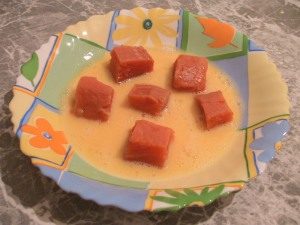 - Потопете розовите кубчета сьомга в разбито яйце.