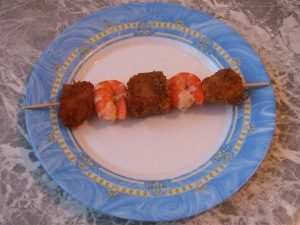 - Върху дървени шишчета, редуващи се, пържени парчета риба и обелени варени скариди.