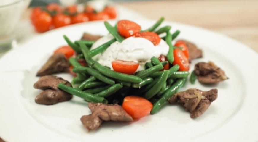 - Сложете боб, половинки домати на дълбока чиния Черен и пилешки дробчета. Сервирайте соса в отделни купички или sauceboat.