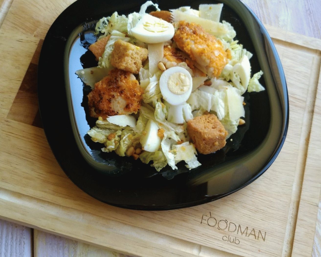 Не знам как да нарека тази салата, за да бъда честен. Винаги Моята приятелка се подготвя от работа и го нарича Цезар. В моята това е съвсем различна салата. Исках да добавя тук от моите промени, така че пържих пилето в панировка, но това изобщо не е необходимо. Салатата е вкусна така или иначе.
