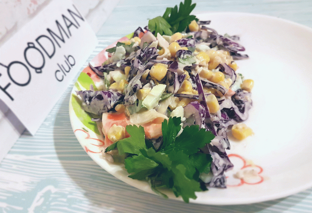 Много вкусна и лесна за приготвяне домашна салата с червено зеле, месо от раци и царевица. Прави се много бързо!