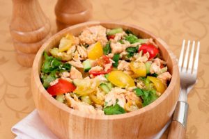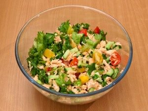 - В голяма купа, ръчно накъсайте листа от маруля, добавете Домати, краставици, риба, изсипете дресинг, разбъркайте внимателно.