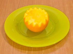 - Измийте портокалите със специален или обикновен нож, за да направите зигзаги в кръг, внимателно разделете портокала на две части.
