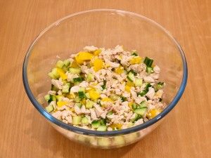 - В купа комбинирайте филетата, портокалите, краставиците, леко сол, добавете майонеза, разбъркайте добре.