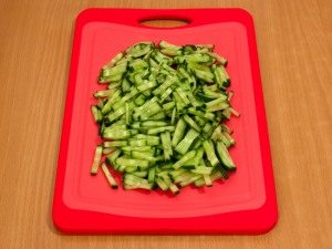 - В обемна купа комбинирайте леко птичето филе, яйцето, краставиците сол, разбъркайте.