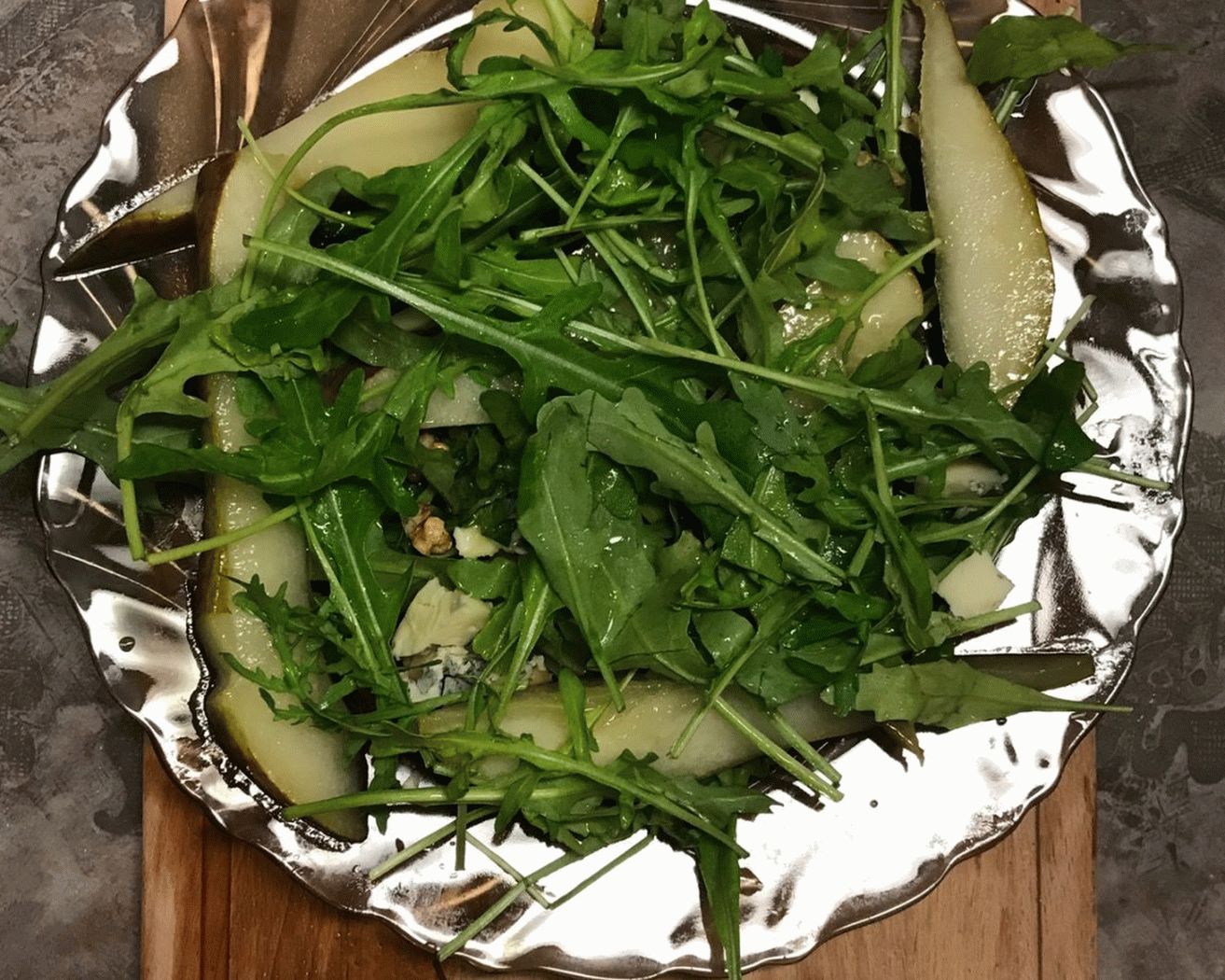 - Сложете круша отгоре, изсипете салата в тиган със сос, вземете останалата част от рукола и легнете отгоре. служа салата, когато крушата е още студена.