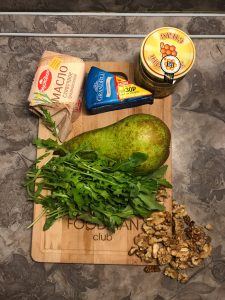 - Изплакнете рукола, нарежете орехите по-малки, но не и прах. Нарежете сиренето. Поставете всичко в чиния (положете рукола 2/3 от общия брой).