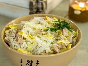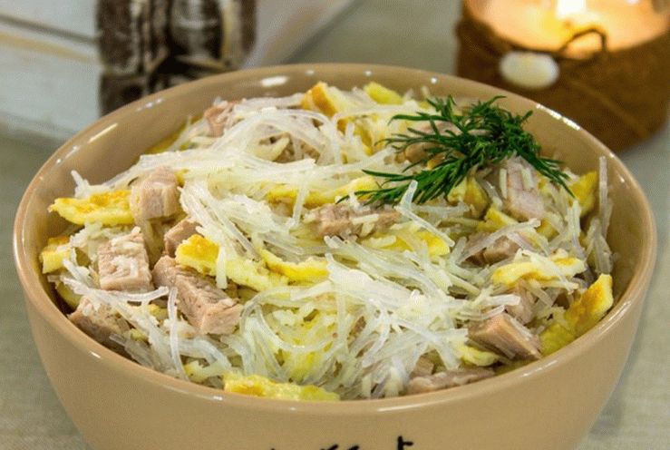 Вкусна, сърдечна салата с фуния, която може да замени вечеря.Месото трябва да се приема на постно, пълномаслено отсечен.