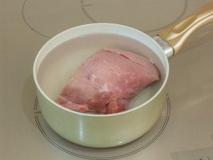 - Сложете свинското месо на огъня, доведете до кипене, отстранете пяната, гответе още половин час. Охладеното месо се нарязва на влакната на малки кубчета.
