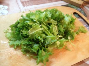 - Измийте листата от маруля предварително, за да може да остави излишната влага. Когато салатата изсъхне, не я нарязвайте, по-добре е да разкъсате листата ръце на малки парченца.