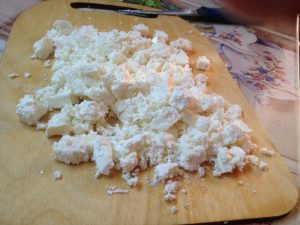 - Нарежете сиренето фета на кубчета или натрошете с нож на малки парчета.