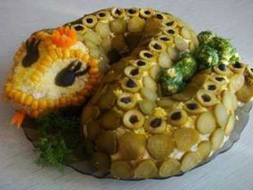 - Остава да украсите салатата. Нарежете туршиите на тънки кръгове и ги поставете като имитация на змийски люспи. Направете маслини очи и модел. От консервираните царевични зърна изобразяват модел около главата. От варен морков изрежете змийски език и короната. Свържете въображението си максимално и смело украсете змията. От останалата маса настъргани яйца, майонеза, билки и чесън можете да извайвате змийски яйца и да докладвате на ястието. От клоните на копър може да направи плевел.