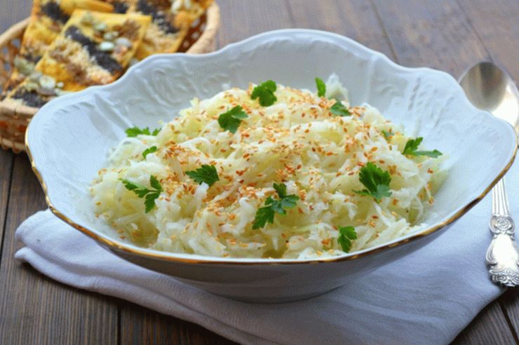 - Добавяме сусам и дресинг към колбаби с джинджифил, разбъркваме. Готовата салата се украсява с листа от целина и магданоз. Салата може сервирайте, приятен апетит!