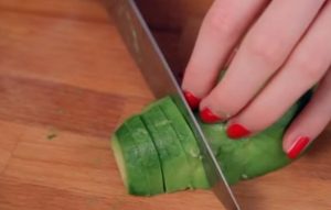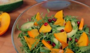 - Разстелете авокадото върху рукола. Каша от японско дърво се нарязва на малки парченца и се разстила отгоре. Поръсете салата със зърна нар.