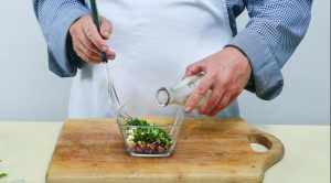 - Нека приготвим превръзка. Нарежете лука, магданоза и чесъна много ситно. Смесете със зехтин и лимонов сок, добавете сол и черен пипер, разбъркайте добре.