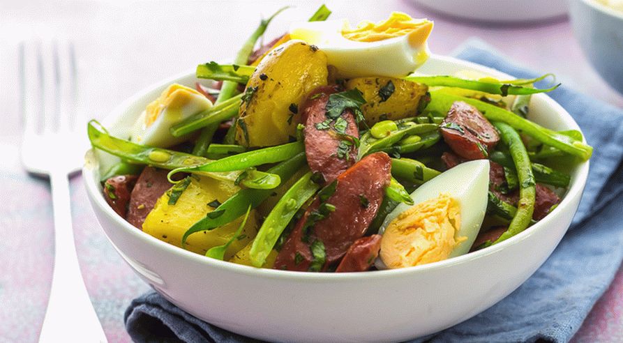 Тази пикантна и вкусна салата от картофи, боб и пикантна свински колбаси са много лесни за приготвяне у дома според моята рецепта. Съветвам ви да направите това обилно ястие за събирания с приятели.