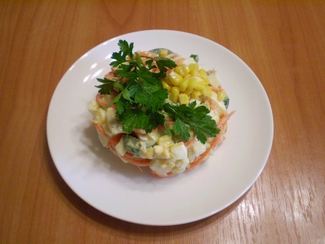 Това е алтернатива на домашна салата с ракови пръчици. ВВ този случай вместо ориз го готвим с корейски моркови. Оказва се вкусно и това ще направи вашето меню по-разнообразни.
