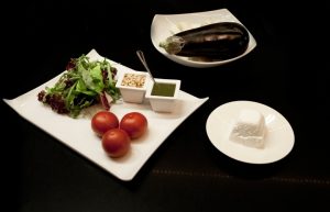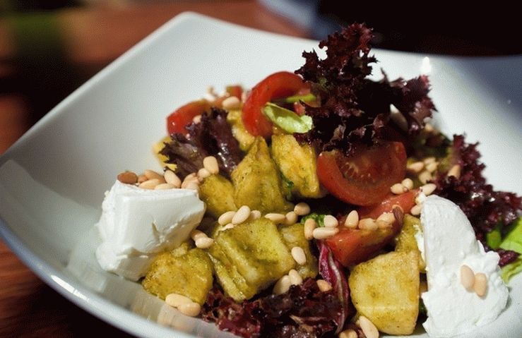 - Сложете сместа от зеленчуци и маруля в чиния, добавете козе сирене, поръсете отгоре с борови ядки. Салата от патладжани и козето сирене е готово!