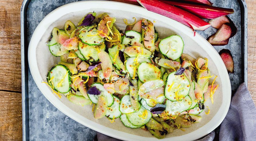 - В купа за салата смесете ревен с краставици, дресинг и билки, оставете да вари 10 минути и сервирайте!