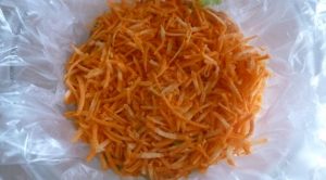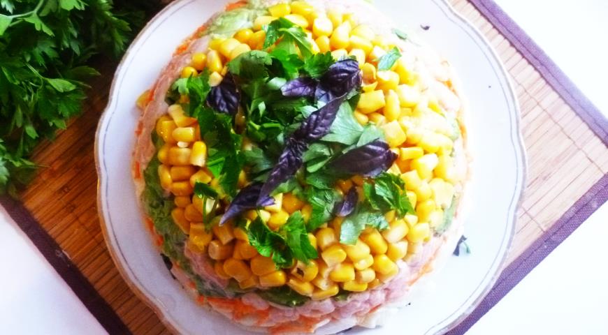 - Покрийте голяма дълбока купа за салата с прилепващ филм. До дъното купички за салата разстилате царевицата, подравнете в един слой. след разпределете половината нарязани листа от маруля, след това скаридите. Поливайте превръзката. След това разстелете настъргания морков.