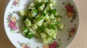 - Нарежете краставицата на кубчета. Смесете в купа с черен пипер, сол, оцет и копър.