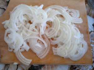 - Лукът трябва да бъде обелен и нарязан на половин пръстени.