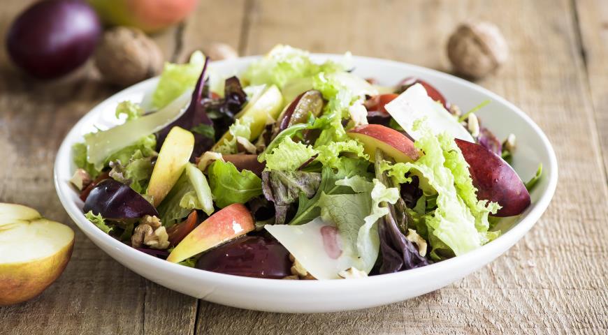 Една вкусна салата от ябълки, сливи и чери домати е много проста и гответе бързо у дома. Тази лека салата с приятна комбинация Съветвам ви да правите ядки, домати и плодове на здрави обратна захапка.