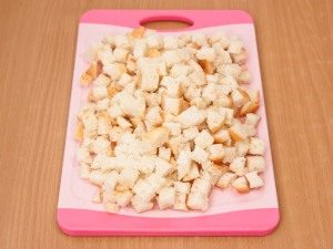 - Нарежете хляба на малки кубчета. Загрейте растително масло в тиган запържете кубчетата хляб в него до златисто кафяво.