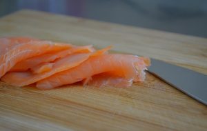 - Нарежете червената риба на тънки ивици.