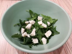 - Нарежете сиренето на кубчета и разпределете отгоре върху рукола.
