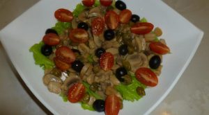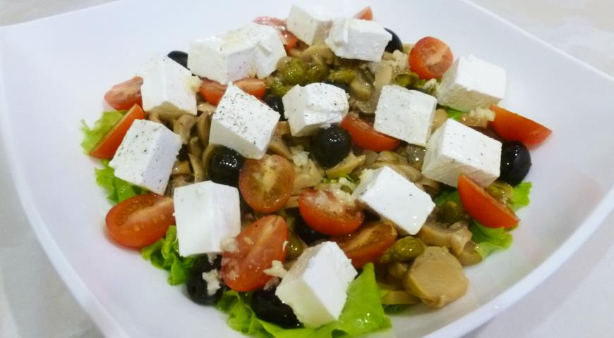 Вкусна салата с шампиньони, маслини и фета, която лесно да се готви у дома, може да се направи на празничната трапеза.