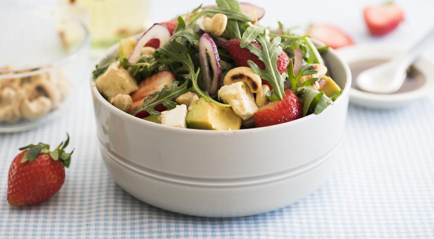 Ягодите вървят добре със осоленото сирене и зеленчуците. Опитайте да приготвите вкусна салата с ягоди, авокадо и рукола. Това ястие може да се направи с фета или козе сирене.