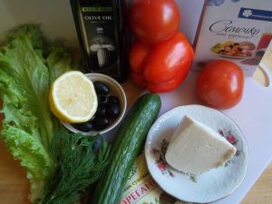 - Нарежете доматите, чушката и краставицата на големи филийки. Нарязваме маслини на половинки, можете да използвате и маслини.