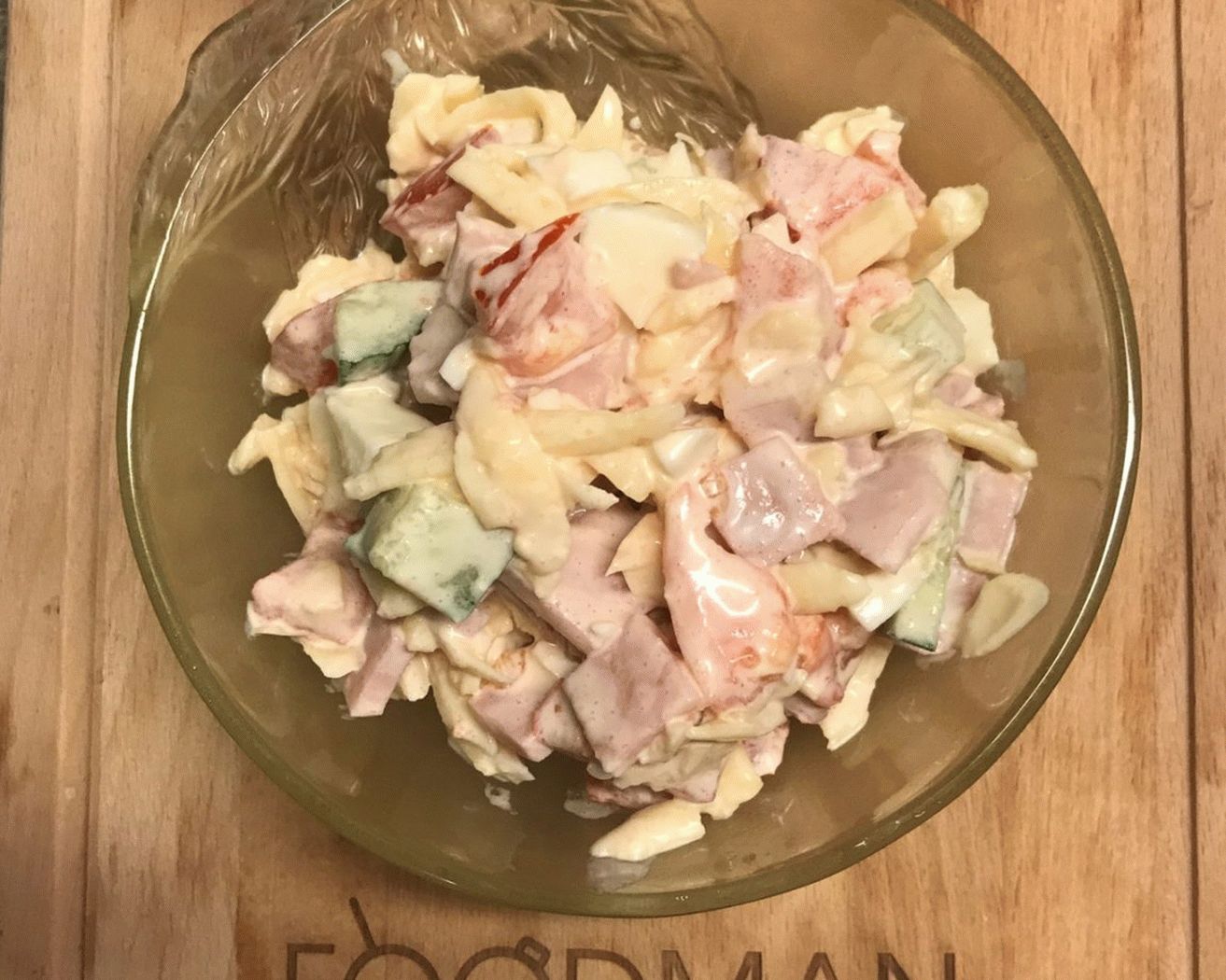 - Нарежете домат, краставица, шунка, настърган кашкавал, нарязани яйца, подправете с майонеза и сол на вкус. Разбъркайте добре това е всичко.