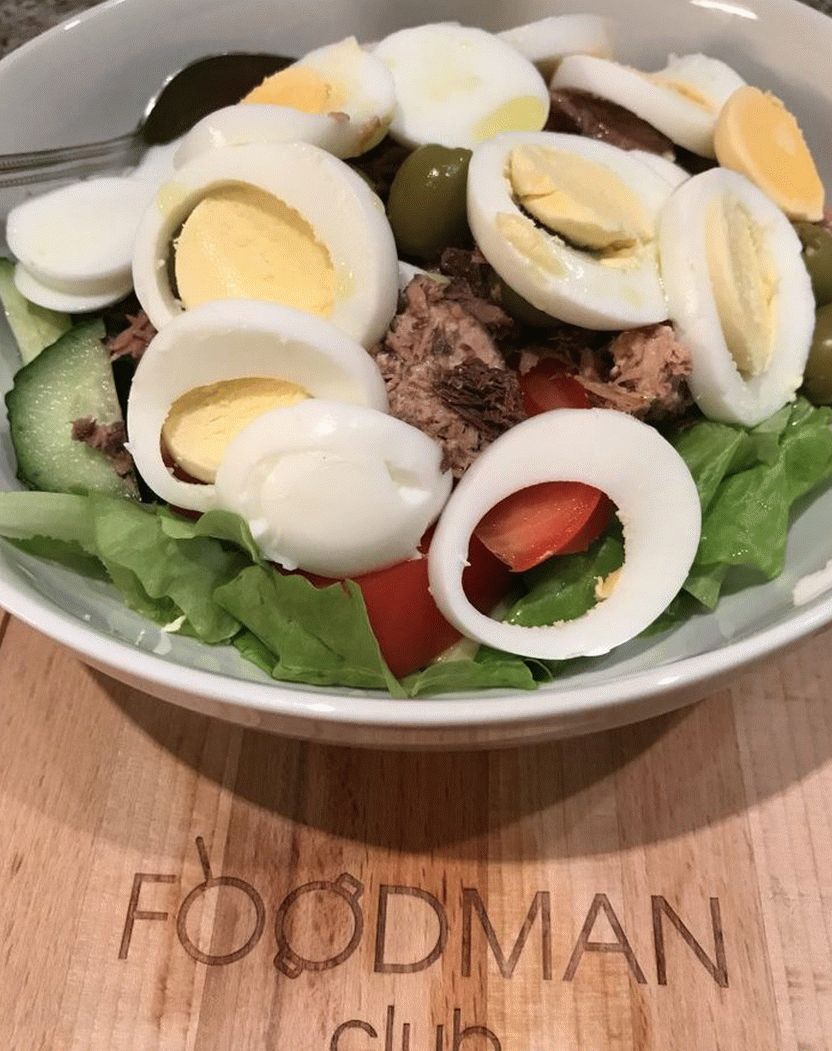 - Изцедете водата от рибата тон и я омесете с вилица. купички за салата