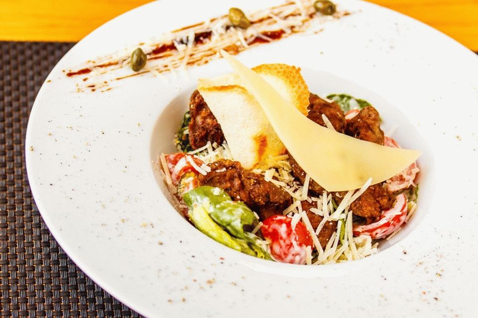 Вкусна салата Цезар с пилешки дробчета, което е лесно Готвенето у дома е друга популярна опция за салата. “Цезар”. Съветвам всички любители на черния дроб да направят това ястие.