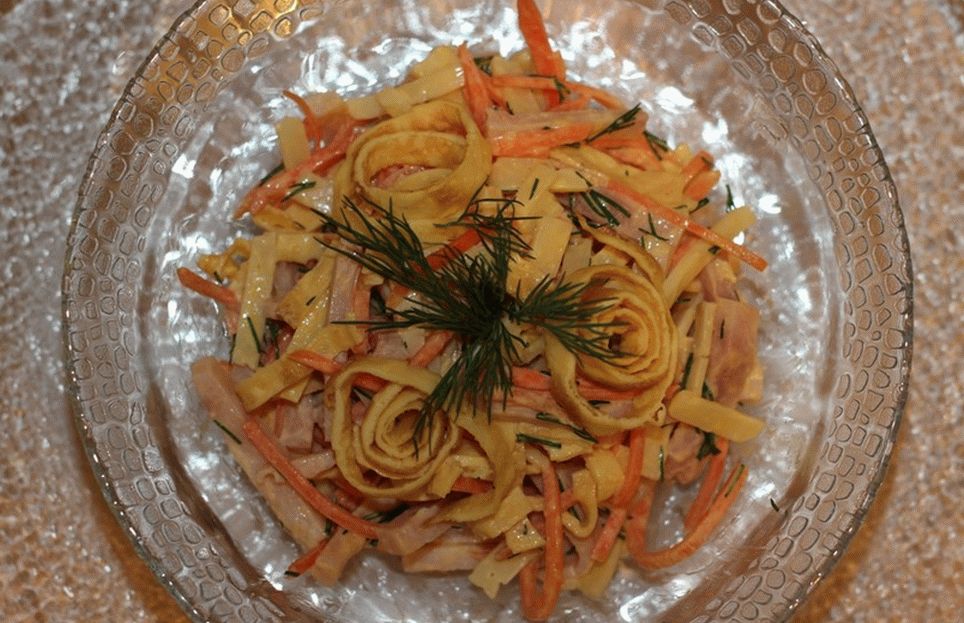 - В купа смесете палачинката, сиренето, шунката, корейските моркови, копър, подправете с майонеза или заквасена сметана и всичко е добре разбърква.