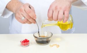 - Първото нещо, което правим, е да подготвим превръзката. смесвам зехтин, балсамов оцет и мед. Смесете до еднаквост.