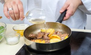 - Поръсете ябълките със захарта, изчакайте захарта карамелизирана. Добавете пилешки дробчета, изсипете коняк и изпарете го. Махнете всичко от огъня.