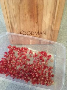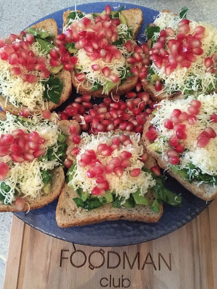 - Сложете авокадото върху хляб, отгоре поръсете със сирене и зърна нар.